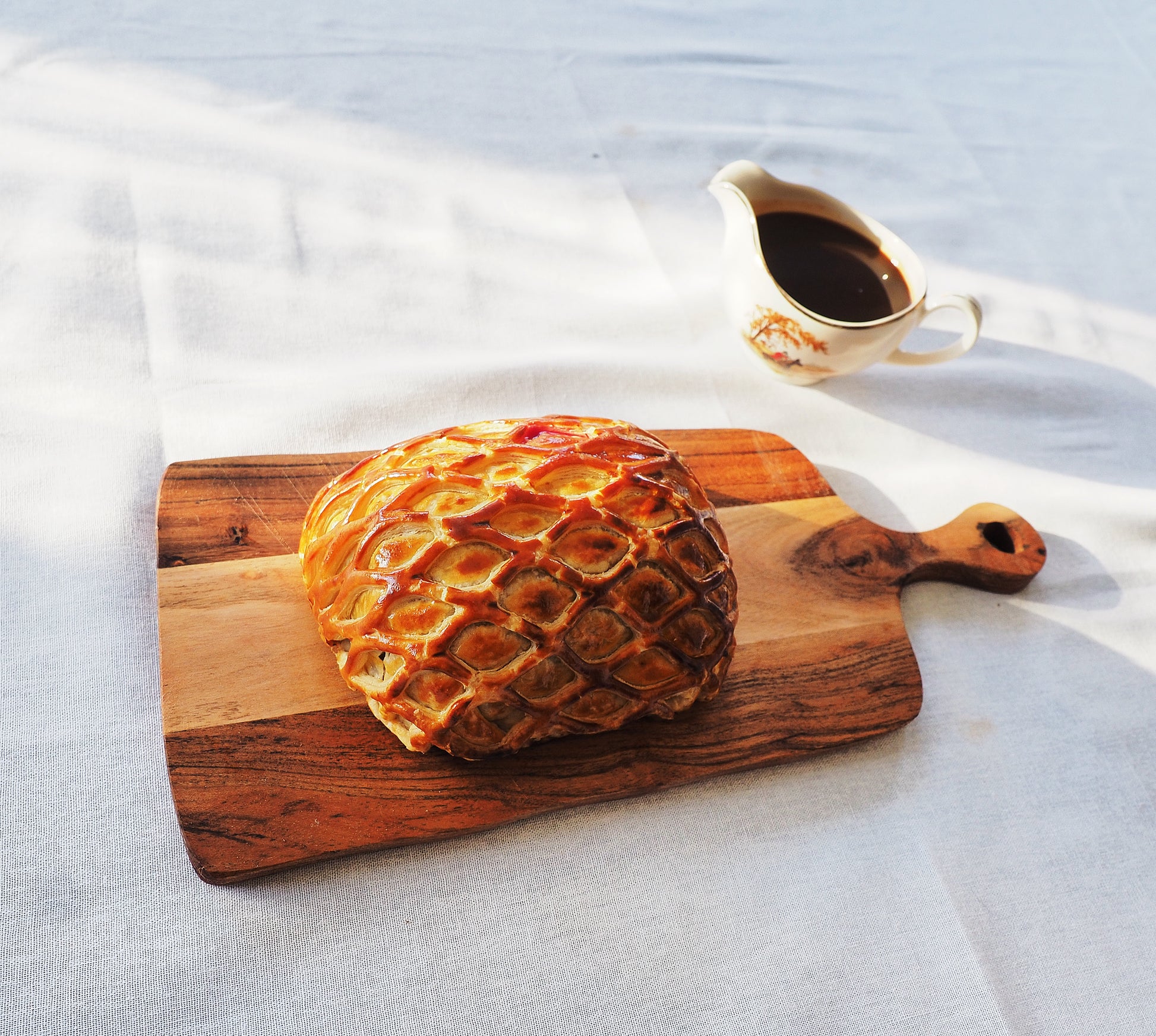 Custom made wellington which is ready to bake, with a taste of our complimentary signature sauce.